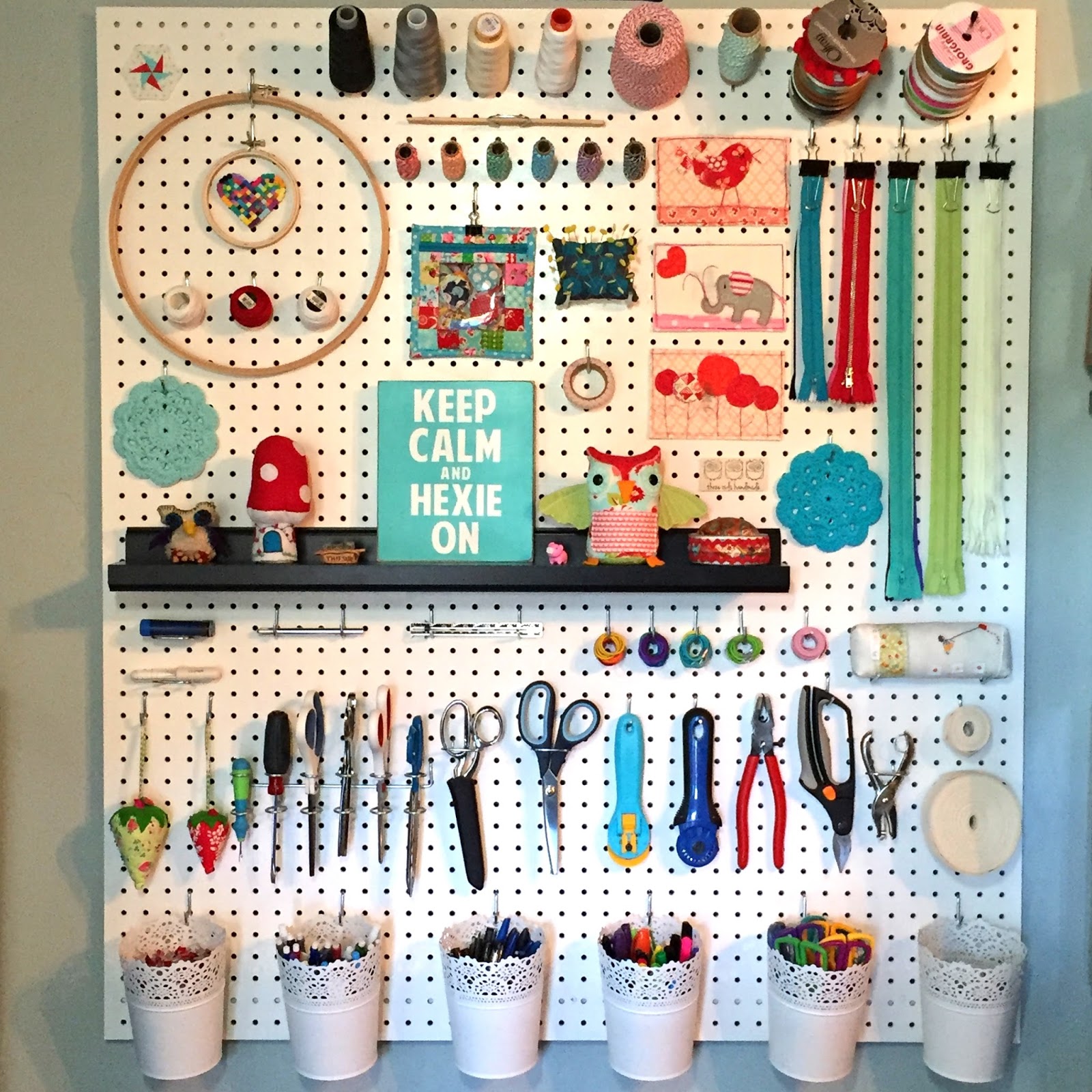 The top of the pegboard houses cone thread, baker's twine, ribbon, perle cotton, embroidery hoops, washi tape, a hexie pincushion I received in a swap with Tracy Berrett of Quilter's Candy Box, Pouch with a View filled with 1/2" hexies, zippers, and various treasures including a Bonnie and Camille Ruby owl made by my talented friend Kelly and a 1960's fabulous pincushion that was my mom's.